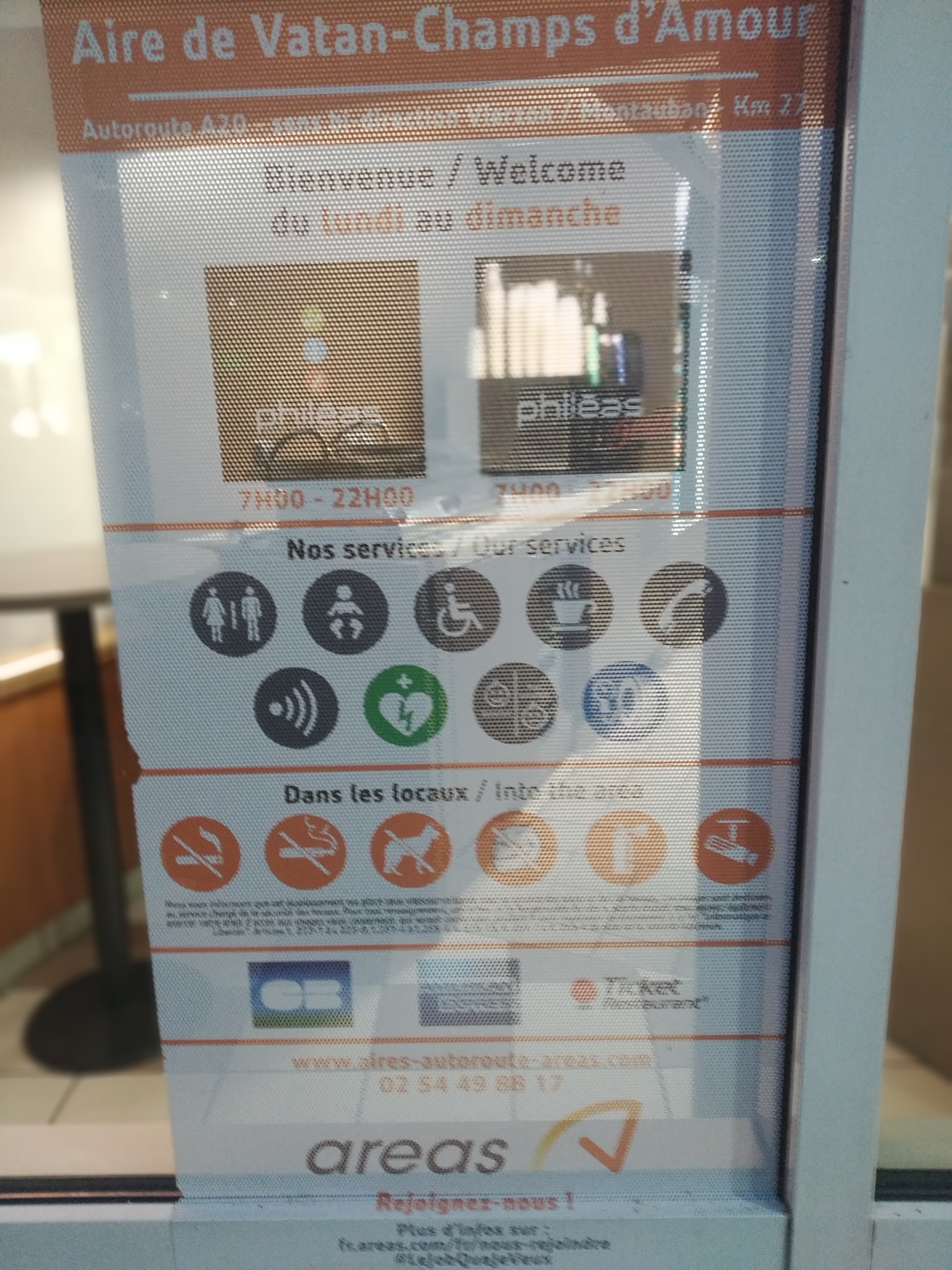 Essayez au maximum de privilégier un autre arrêt Toilettes tres sales, espace machines à café sales également, et prix execessifs Quand au grill Phileas....le personnel a l´image du reste, pas un sourire, pas un bonjour, 2 potiches qui ne répondent pas à votre bonjour, et qui font déjà une tête de 2 pieds de long à 7h du matin.... Bref, à éviter, privilégiez la station d´avant ou d´après